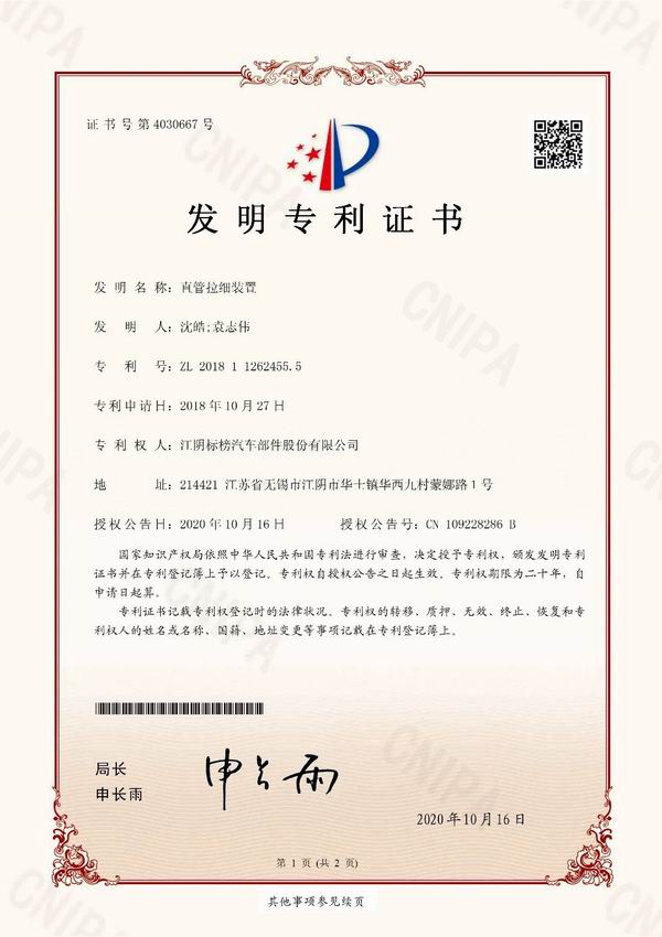 公司研發的“直管拉細裝置”喜獲國家發明專利。